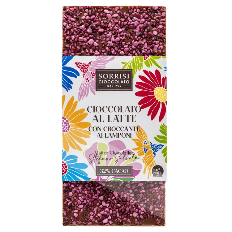 Cioccolato al latte lamponi, die Vollmilchschokolade mit getrockneten Himbeeren von Boella&Sorrisi ist eine köstliche Kombination, die süße Cremigkeit mit fruchtiger Frische vereint. Die Basis bildet zartschmelzende Vollmilchschokolade, hergestellt aus Kakao, Milch und Zucker, die durch ihren ausgewogenen, milden Geschmack und ihre samtige Textur überzeugt. Überzogen ist die Schokolade mit Stücken von gefriergetrockneten Himbeeren, die ihre natürliche Farbe, ihr intensives Aroma und ihre leicht knusprige Konsistenz bewahrt haben. Die süße Schokolade harmoniert perfekt mit der leichten Säure der Himbeeren und schafft ein aufregendes Spiel zwischen cremiger Süße und fruchtiger Intensität. Optisch begeistert die Schokolade mit den leuchtend roten Akzenten der Beeren, die sie zu einem ansprechenden Genuss für Augen und Gaumen machen. Diese Sorte eignet sich als besondere Nascherei, als Geschenk oder als Highlight in kreativen Desserts. Vollmilchschokolade mit getrockneten Himbeeren vereint klassischen Genuss mit einer frischen, modernen Note und ist ein beliebter Favorit für alle Liebhaber fruchtiger Schokoladenvariationen.