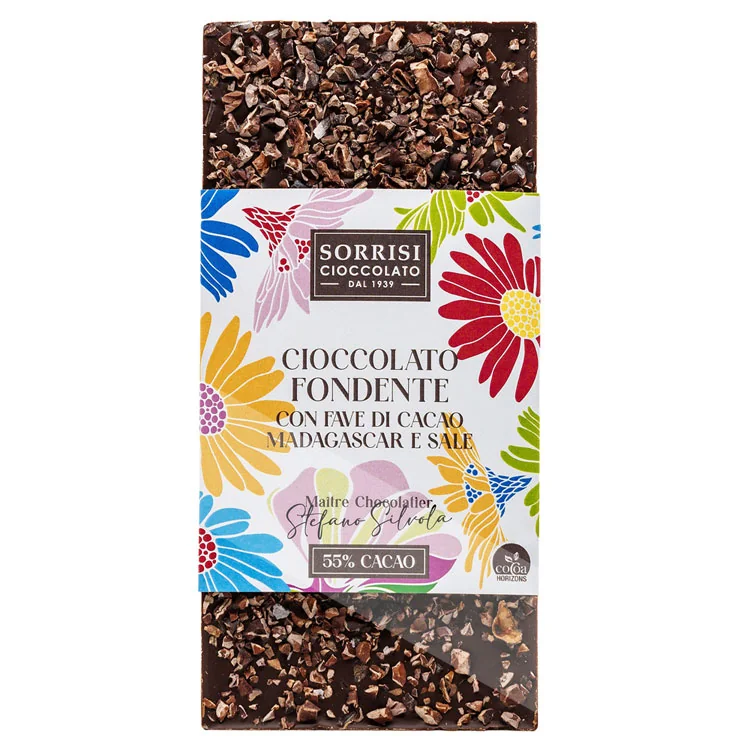 Die Tavoletta Fondente con Fave di Cacao Madagascar e Sale von Boella&Sorrisi zeigt sich als dunkle Schokoladentafel Wüzze und leich salzigen Noten. Die Grundlage ist ein 55%iger Kakaoanteil, hergestellt aus nachhaltig angebauten Kakaobohnen aus Madagaskar, deren Herkunft für die typische, feinfruchtige Aromatik sorgt. Bereits der Duft verrät Noten von dunklem Kakao, roten Früchten und einem Hauch warmen Gewürzen.